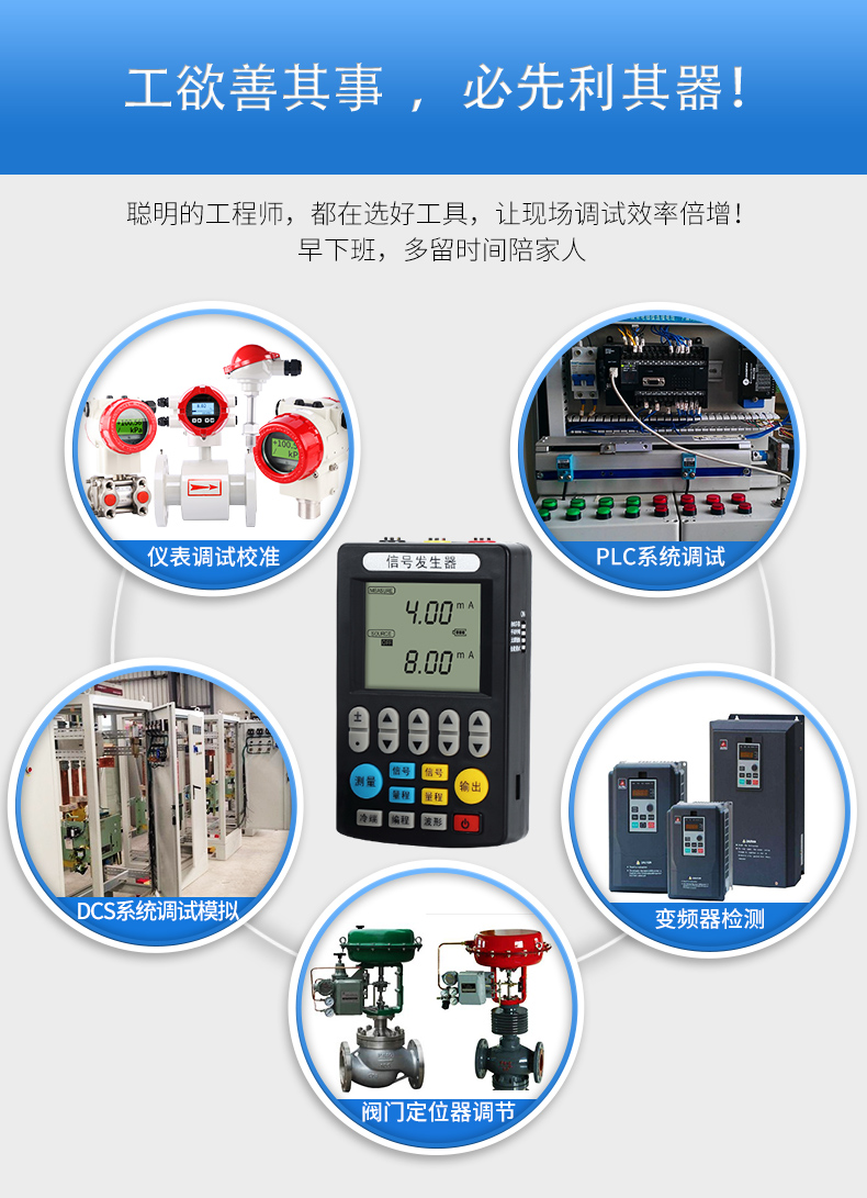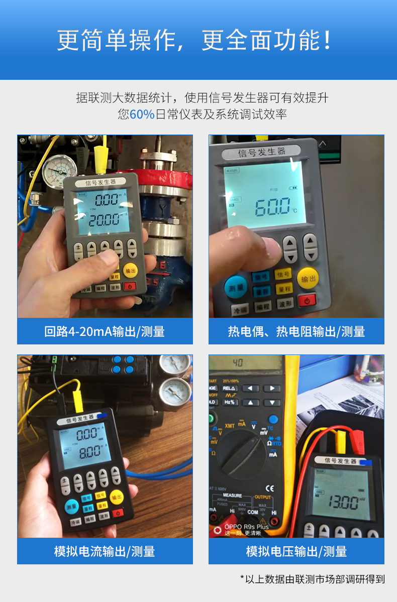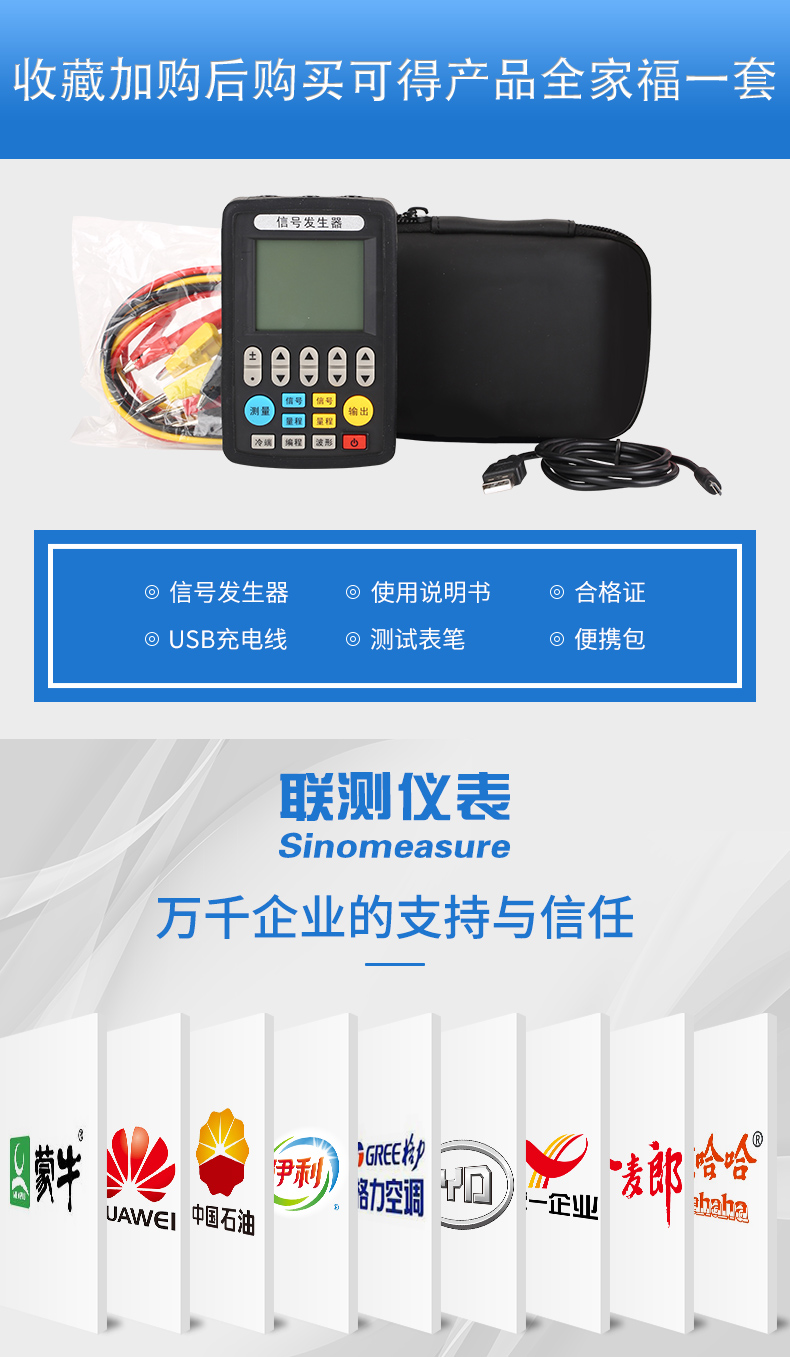 信號發生器具有多種信號的測量和輸出功能,包括電壓、電流、熱電偶,采用高清LCD液晶屏和功能分明的硅膠按鍵,操作簡單,待機時間長,精度高,并且具有可編程輸出的功能。