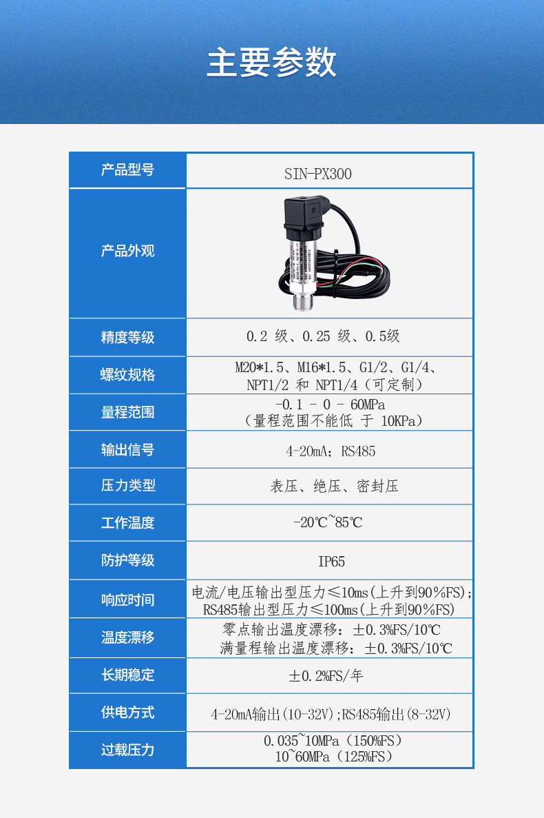 SIN-PX300型數顯壓力變送器采用無縫焊接結構,可批量化生產,經濟、可靠,具有良好的適應性,可應用于各種復雜的環境,該產品輸出形式多樣